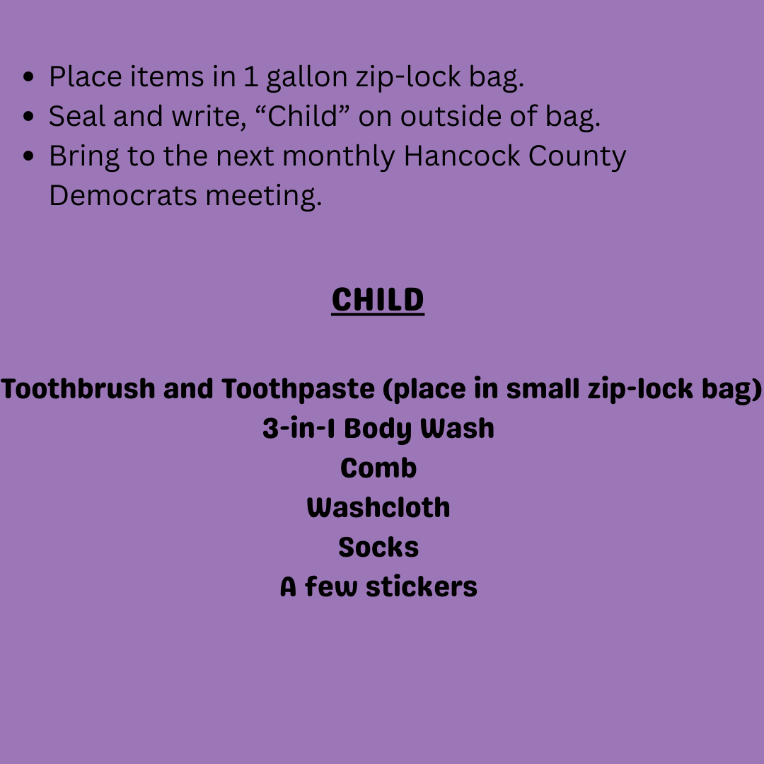 The list of needed items and how to pack them are below. Feel free to bring individual items or pack them fully. All donations can be turned in at any meeting or event.