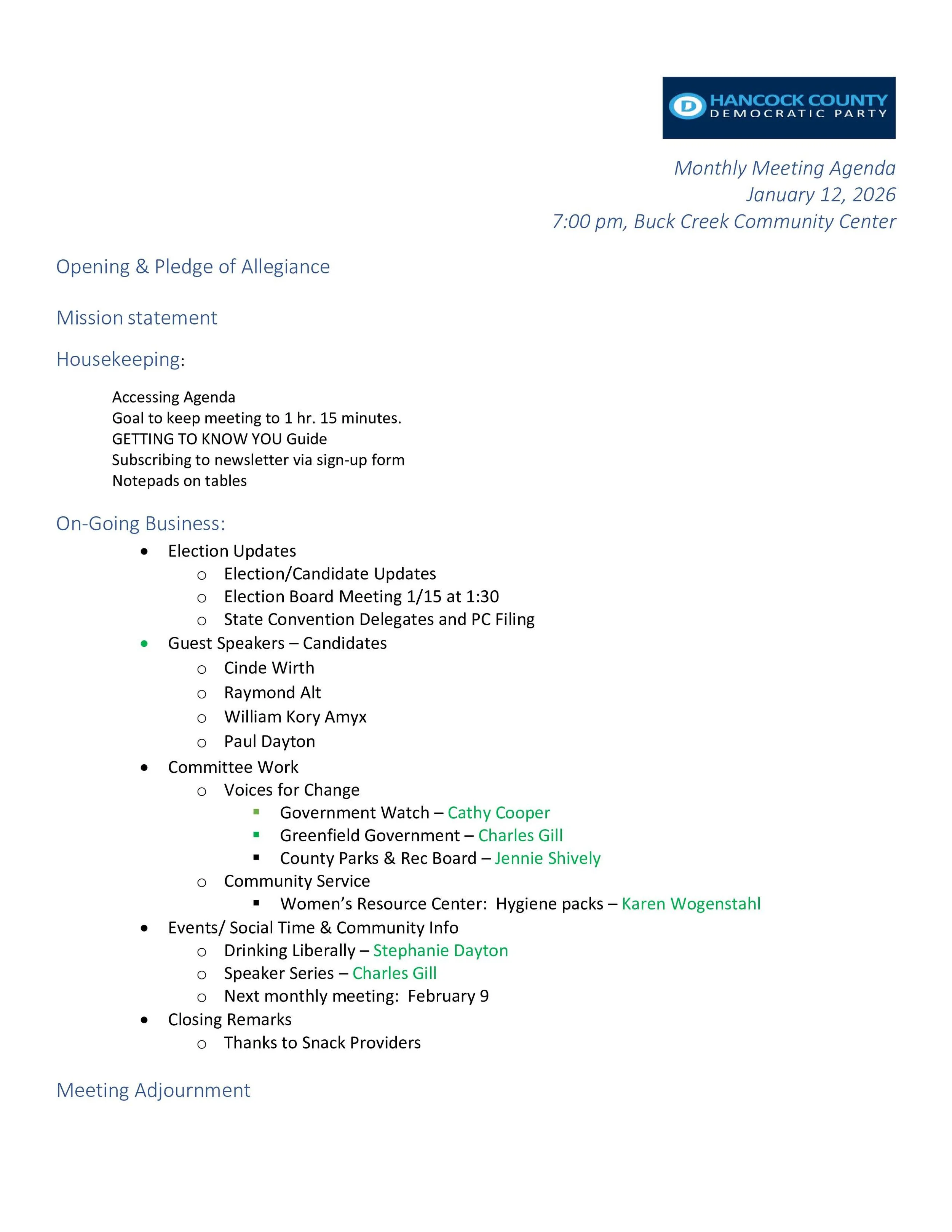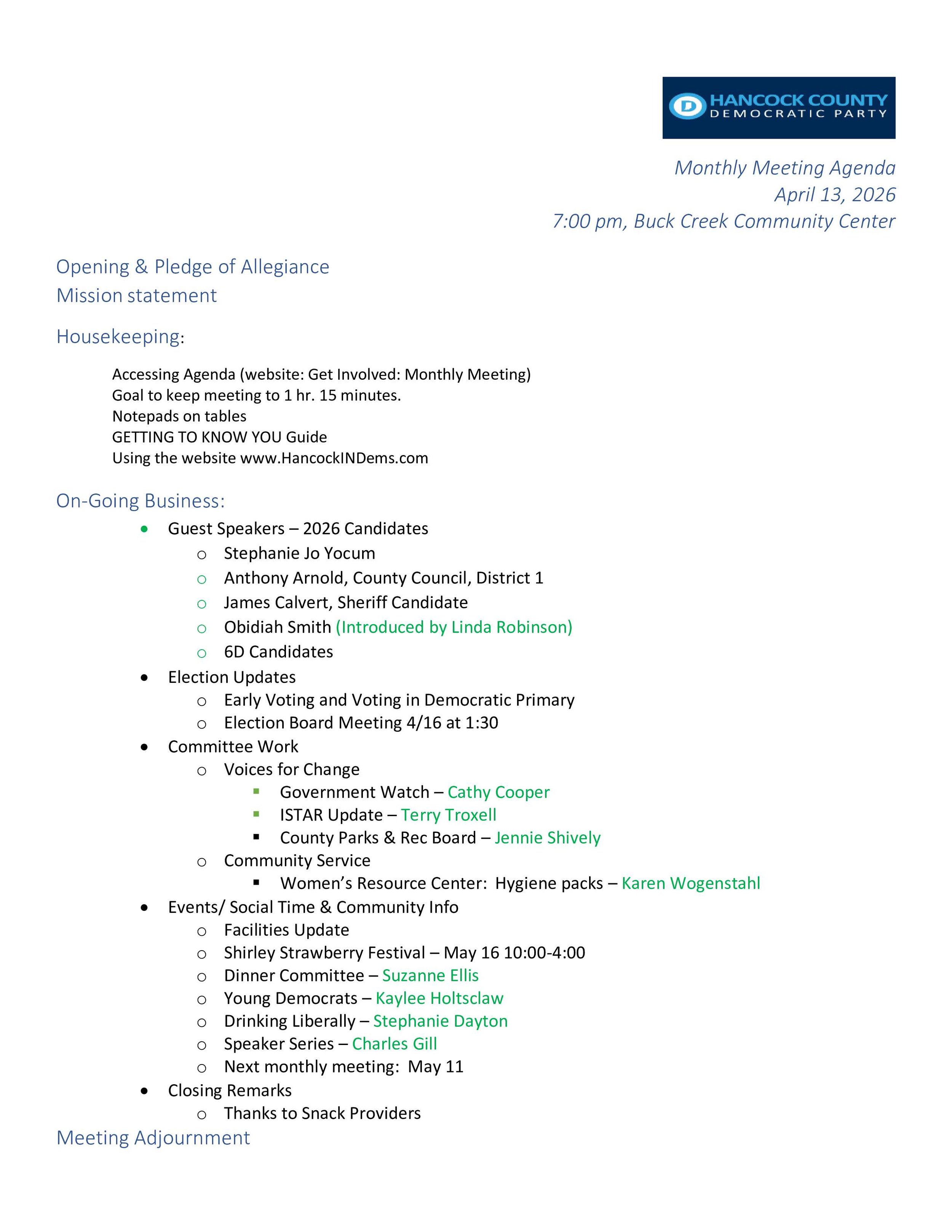 Our monthly meetings are where local Democrats come together to connect, plan, and take action. Whether you’re a longtime supporter or just curious, these gatherings are a great way to: