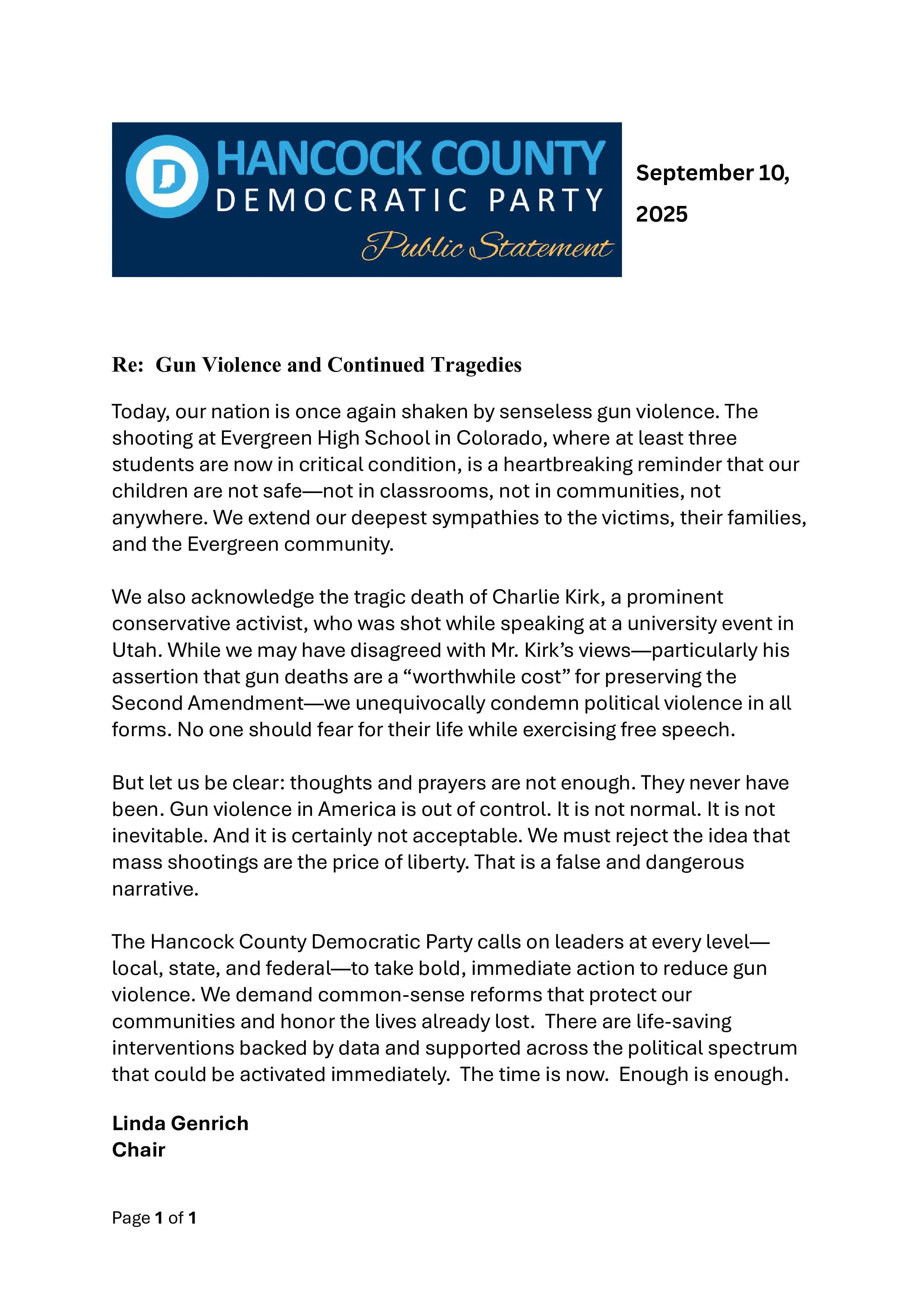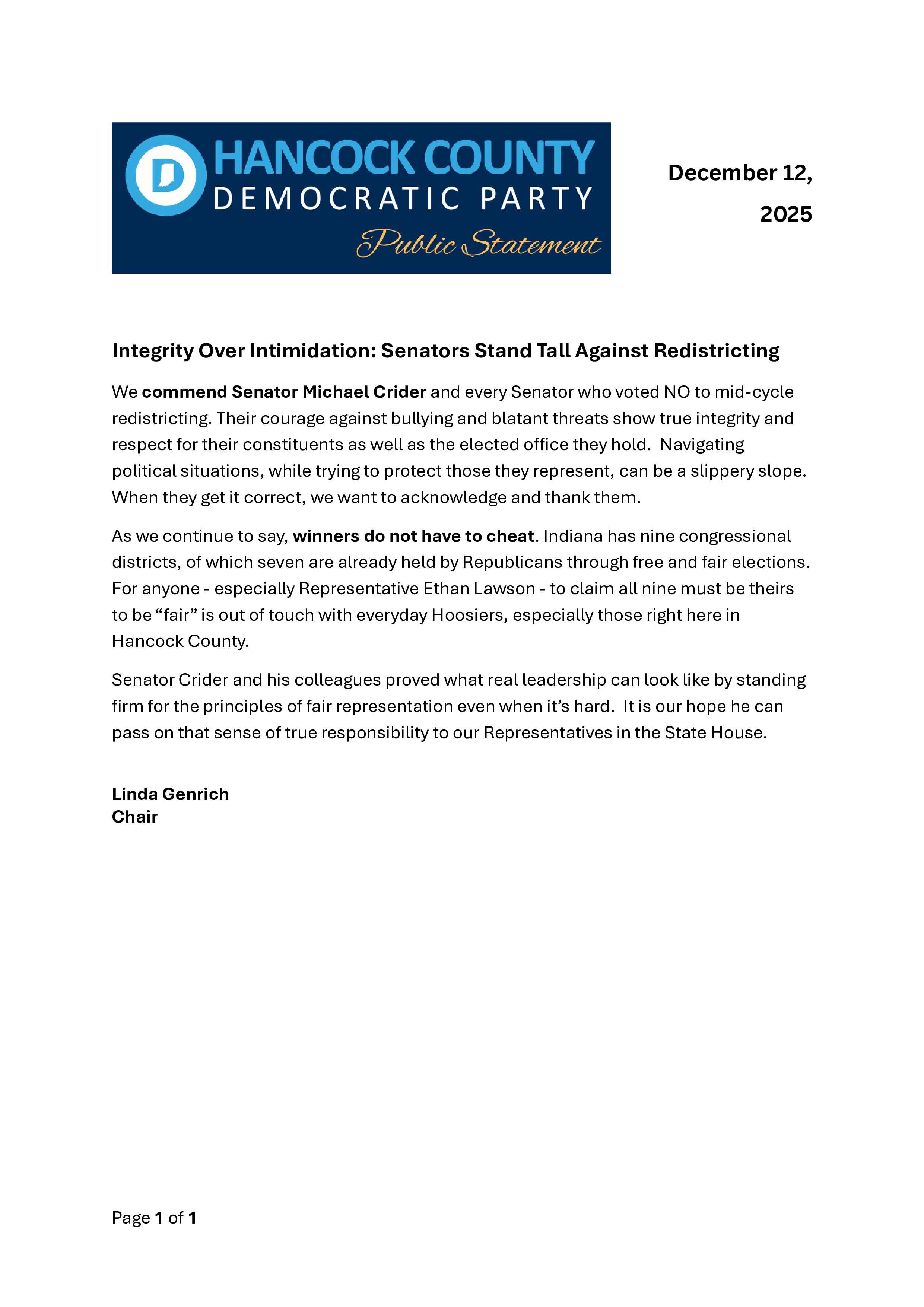 Statements & Press Releases For additional information regarding press releases & statements: Chair@HancockIndianaDemocrats.com Saturday, March 15, 2025 Thursday, May 8, 2025
